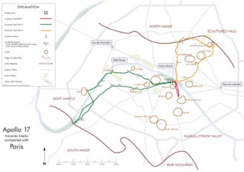 Last but not least, in three EVAs lasting over 22 hours, Gene Cernan and Harrison “Jack” Schmitt would have driven from the LM at the Notre Dame west to the Eiffel Tower and all the way along the Seine to the edge of Paris, 7.6 km from the LM, and back, and then almost as far north as the Sacre Coeur.