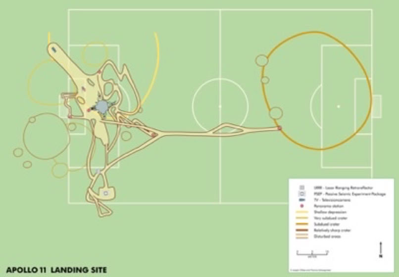 While Buzz stayed near the Lunar Module setting up equipment, during their 2 1/2 hour EVA Neil walked to the nearest crater no further away than the edge of a baseball field (with the LM on the mound), or not even as far as the opponents’ penalty area (with the LM on the penalty spot).