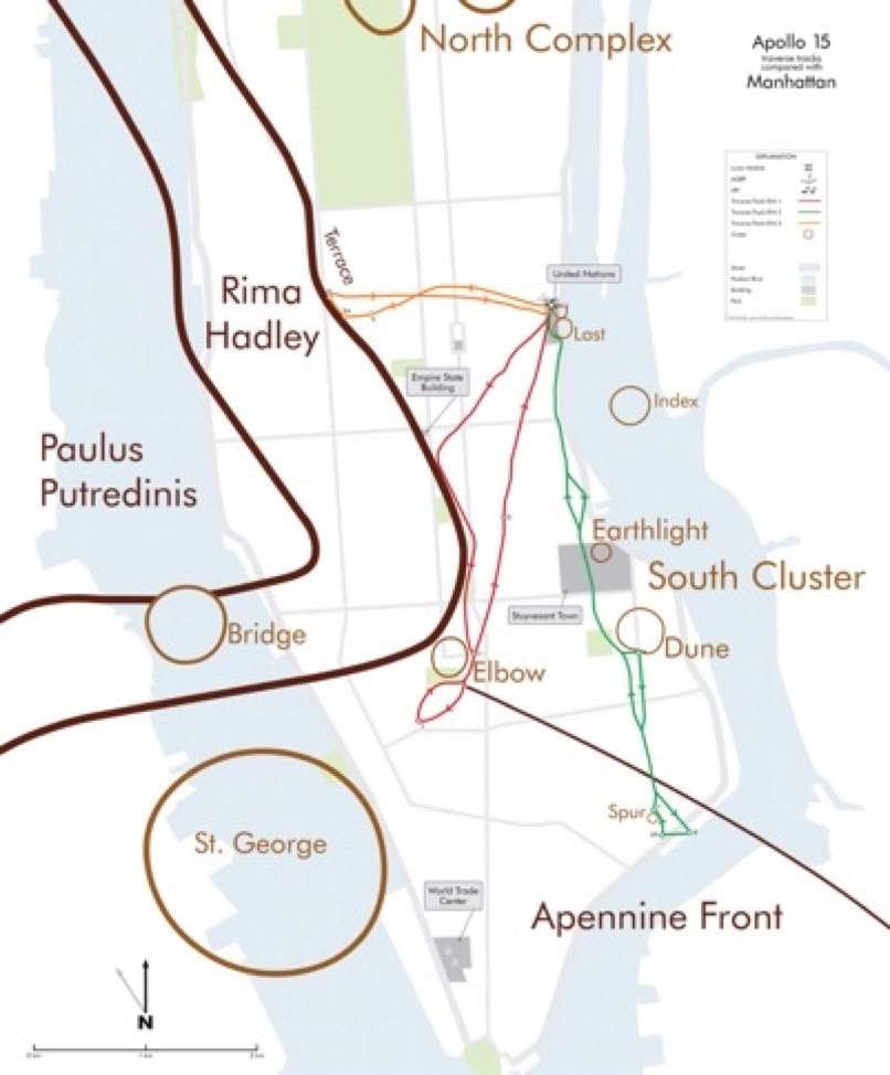 Dave Scott and Jim Irwin flew the first J-mission, which meant that they were equipped to stay on the moon for longer, take longer EVAs and they took the first Lunar Roving Vehicle, or LRV. Their three EVAs totaled more than 19 hours, during which time they drove around much of Manhattan from the UN building west to Times Square on the edge of the Hadley Rille, then past the Empire State Building to West Village, and lastly down to the Lower East Side.