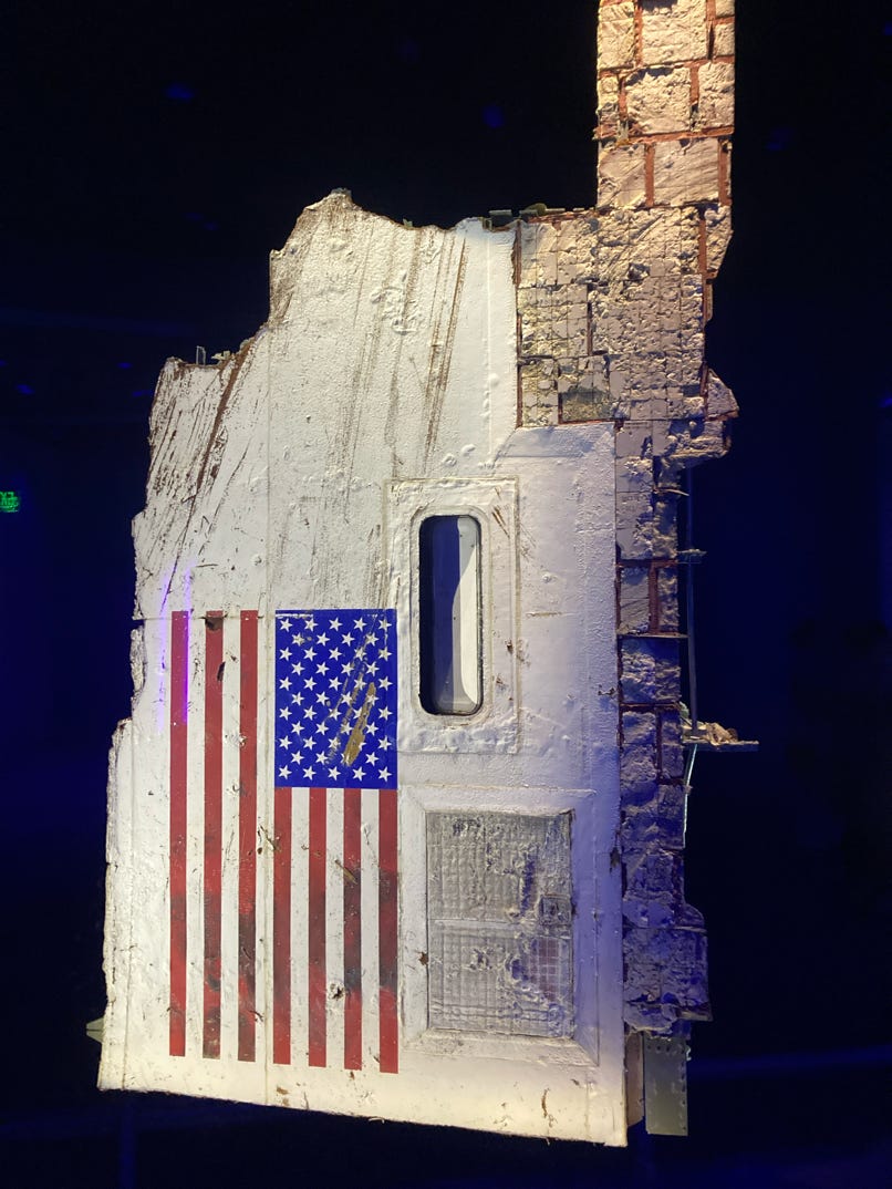 The section from Challenger’s left side bearing the Star-Spangled Banner was removed from the silo and put on display in 2015 as a memorial at the Kennedy Space Center.