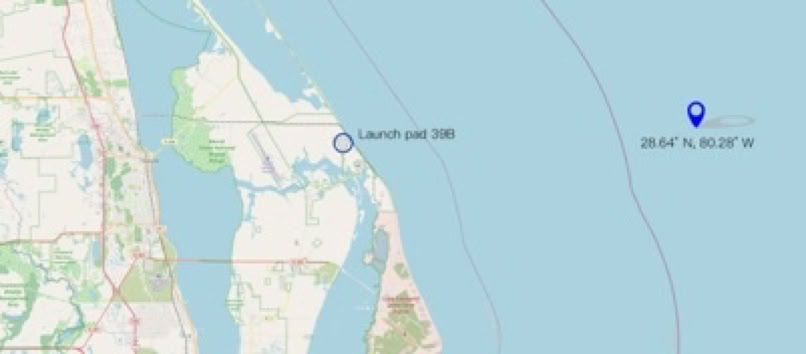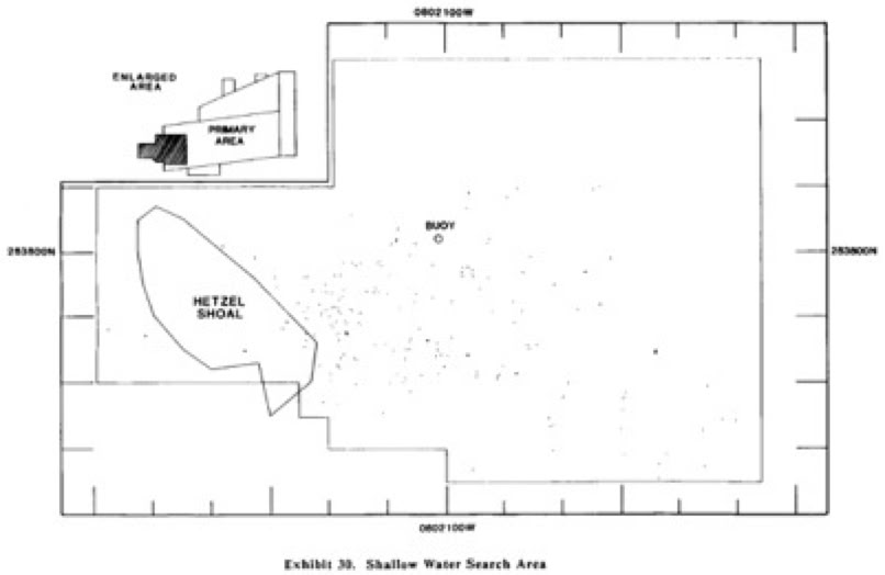 During the search the site was known as "Target 67" within a debris field about 5 miles by 7 miles around Hetzel Shoal within the area labeled G on the salvage map, about 16 miles east of the pad at 28.64° north, 80.28° west.