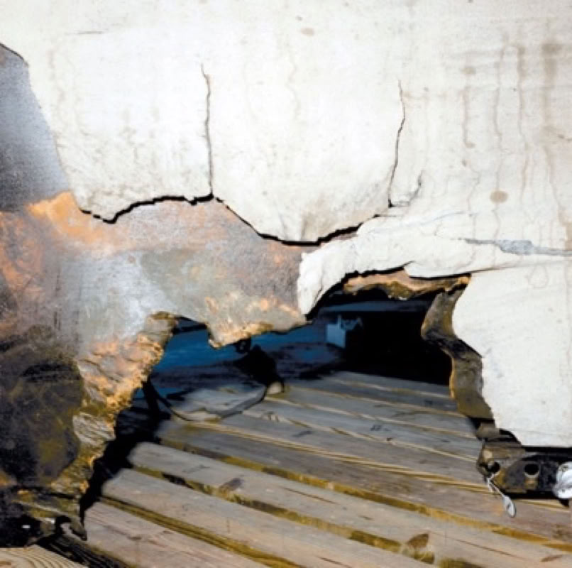 It took about 8 seconds for the blow-by plume to burn through the lower support holding the SRB to the external tank, and once it was loose the SRB rotated. This caused a significant lateral acceleration at 72.5 seconds. On a tape from a ‘black box recorder’ recovered weeks later, Mike Smith was heard to say “Uh, oh” at 73 seconds. The loose SRB then rotated back and ruptured the ET causing uncontrolled burning of the liquid hydrogen and oxygen and consequently, in a matter of milliseconds, the disintegration of the ET that holds the stack together at 73.2 seconds. This was immediately followed by 100 milliseconds of interference on the downlink, the subsequent break-up of the orbiter and complete loss of signal 74.1 seconds after launch.