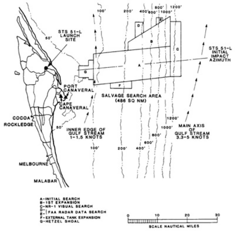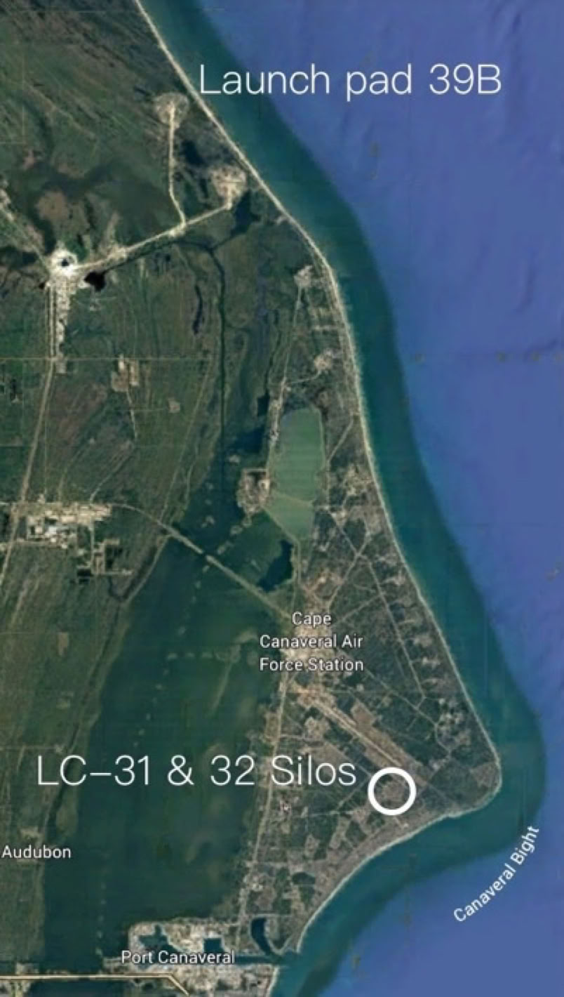 In January 1987, almost a year after the disaster, all of the recovered debris was transferred to Cape Canaveral Air Force Station, about about 2 miles south of the launch site. There the debris was placed in two disused Minuteman missile silos, LC-31 and LC-32, each 12’ in diameter and 90’ deep.