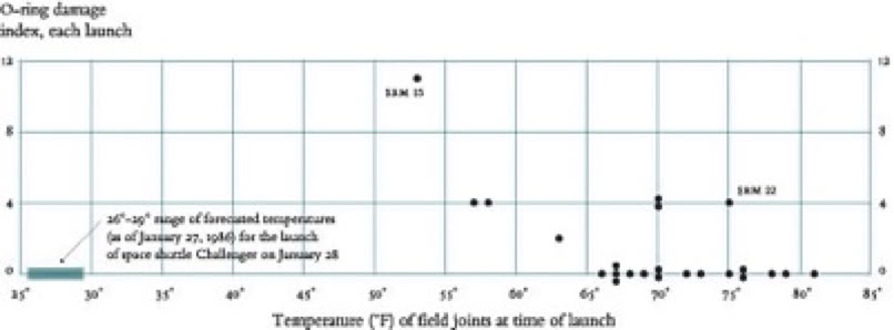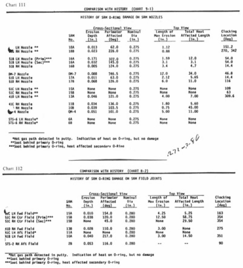 STS 51-C had launched in Jan a year earlier, at around 54F. One O-ring had burned through, and the second O-ring was damaged but had held. In their report of Feb 1985 Thiokol engineers expressed for the first time a significant concern with O-ring function and low temperatures. It’s not actually rocket science to see the risk increase if you extrapolate from the STS 51-C data:
